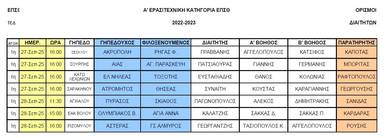 ΠΡΟΓΡΑΜΜΑ ΑΓΩΝΩΝ ΕΠΣΘ (27-28/9/2025)