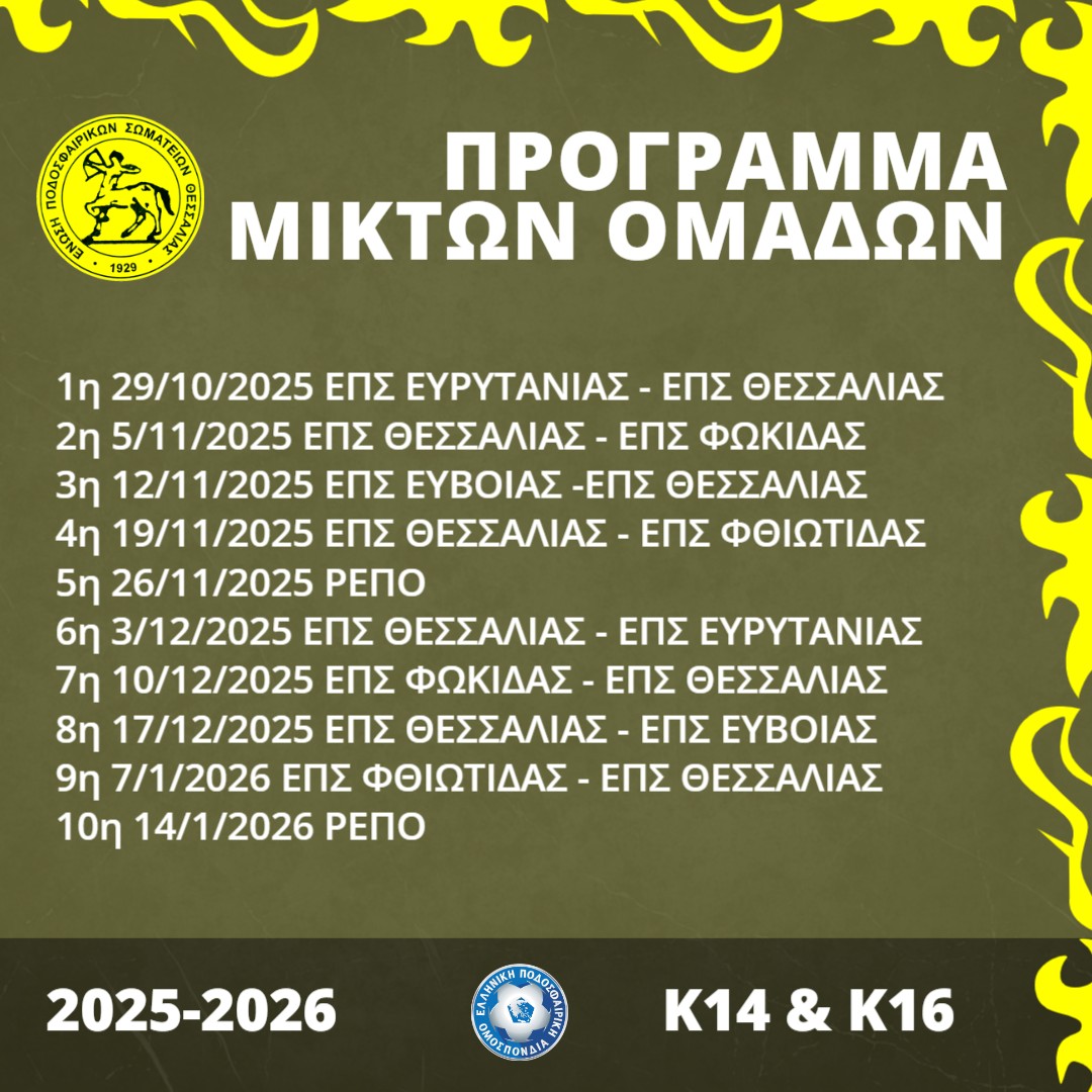 ΠΡΟΓΡΑΜΜΑ ΜΙΚΤΩΝ ΟΜΑΔΩΝ Κ14 - Κ16 ΕΠΣ ΘΕΣΣΑΛΙΑΣ 2025-2026